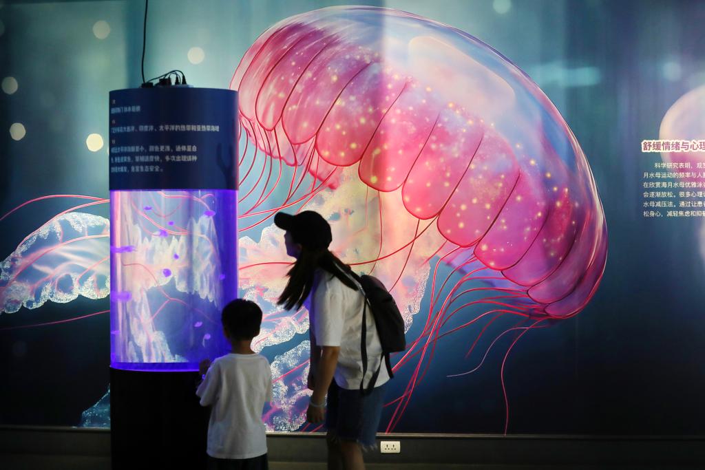 8月16日,小朋友和家长在浙江省嘉兴博物馆参观水母主题展览。
