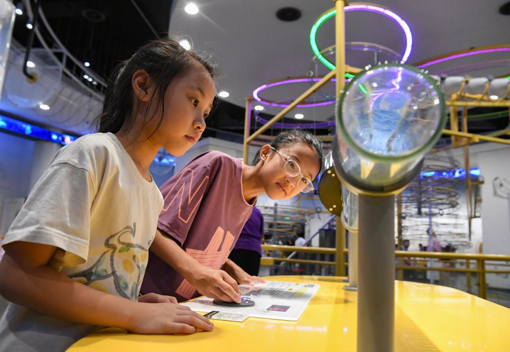 8月16日,小朋友在位于江苏省徐州市云龙区的一家科学探索馆体验科普设备。