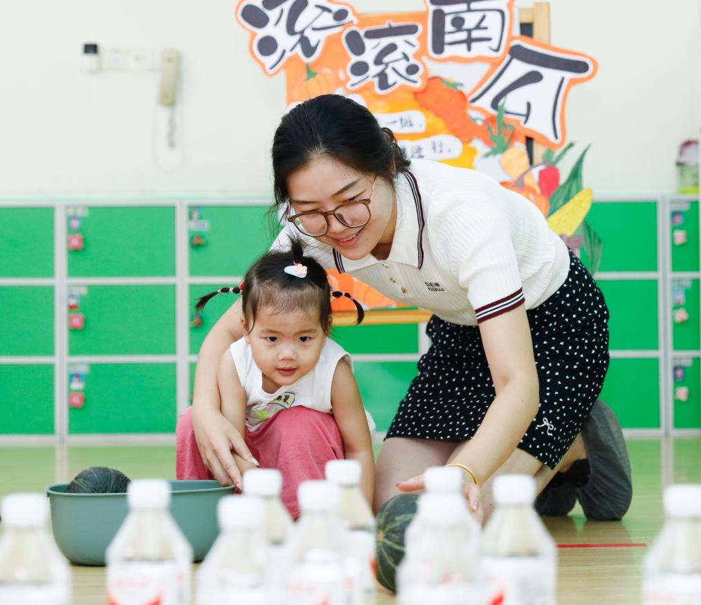 8月16日,在江苏省海安市星禾托育中心高尔夫校区,家长和小朋友在玩“南瓜滚滚”游戏。