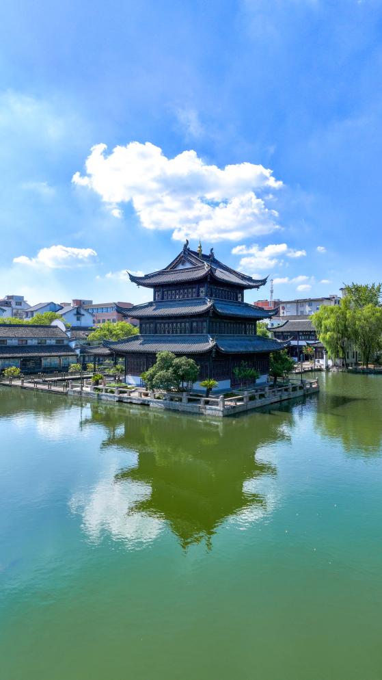 在浙江省湖州市南浔区南浔镇的南浔文园内,古色古香的文昌阁立于水池中央,景色优美,别具韵味。