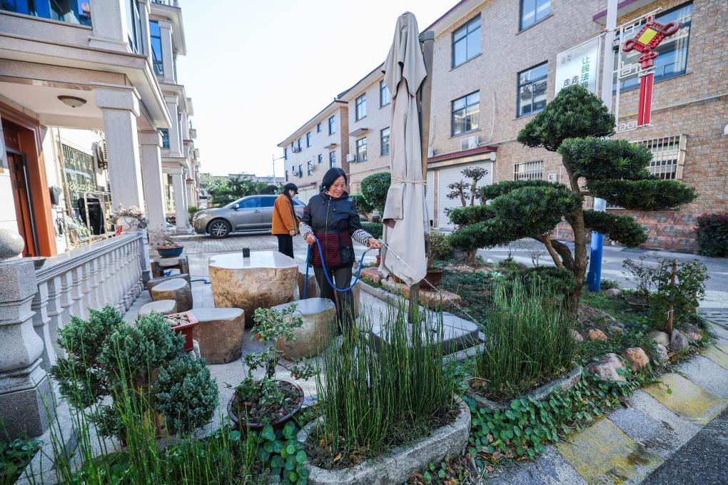 11月19日,吕山乡龙溪村的村民在给自家庭院的绿植浇水。