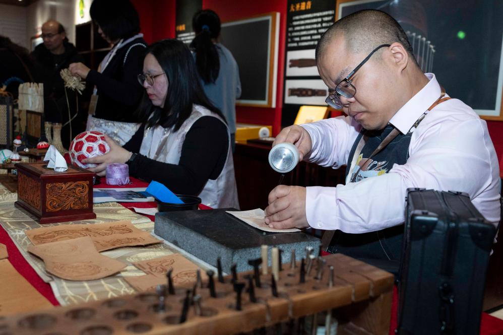 11月21日,在北京故宫文创融合馆举行的“海派匠心·艺韵共融”上海市残疾人文化艺术作品展上,残疾人艺术家(右)展示皮雕技艺。