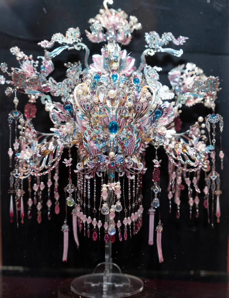 这是11月21日在北京故宫文创融合馆举行的“海派匠心·艺韵共融”上海市残疾人文化艺术作品展上拍摄的“紫鸾凤冠”作品。 记者:才扬
