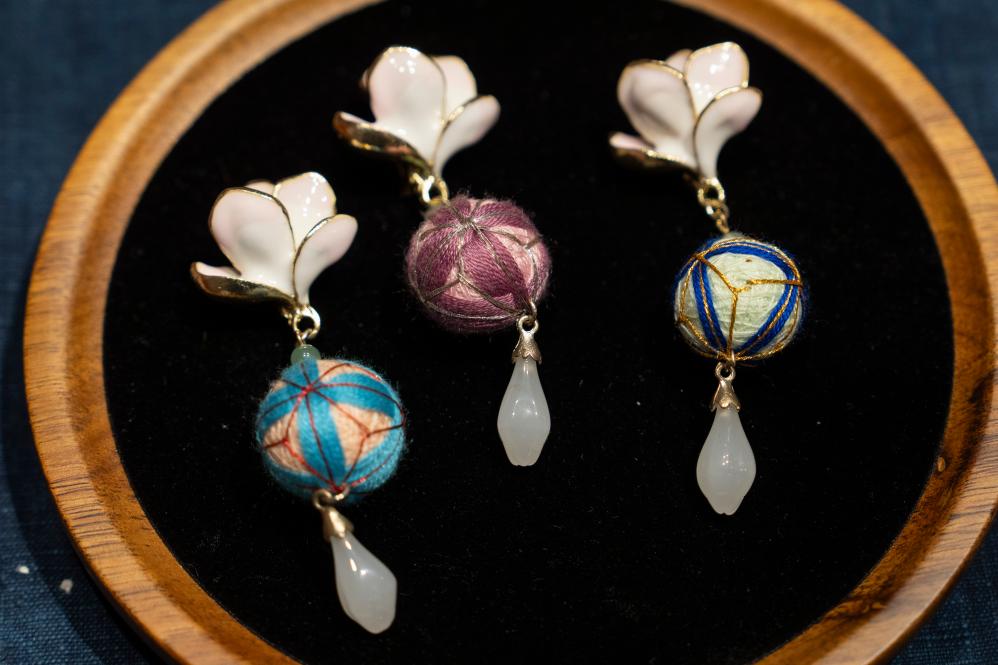 这是11月21日在北京故宫文创融合馆举行的“海派匠心·艺韵共融”上海市残疾人文化艺术作品展上拍摄的“蜡染绣球玉兰花系列”蜡染作品。