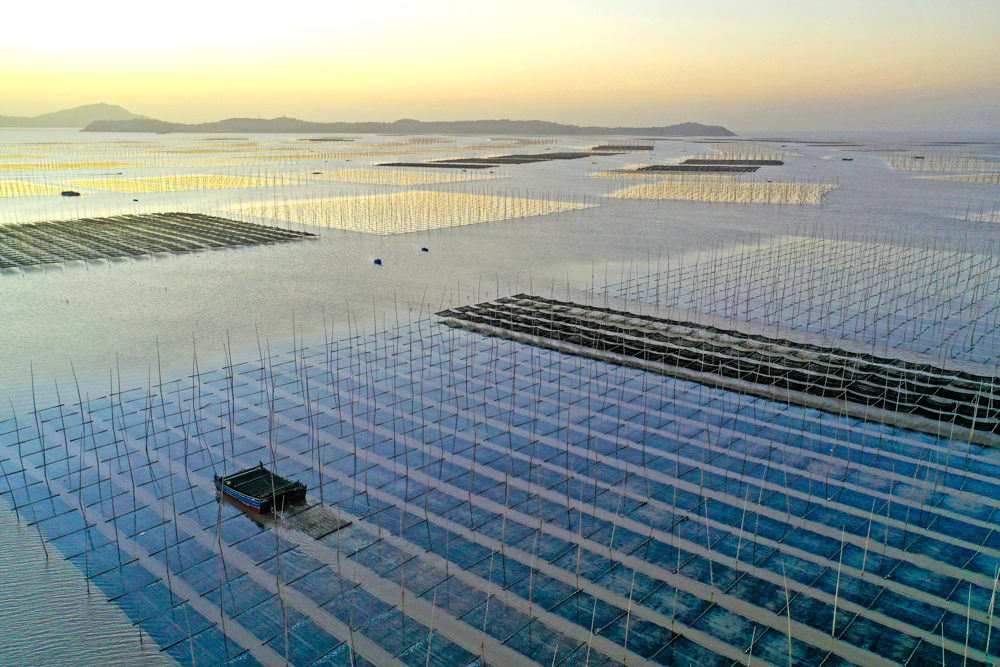 近日,在浙江省玉环市干江镇下礁门村浅海域“海上菜园”,渔民们抓住晴好天气采收紫菜,与远山、朝阳、海湾共同勾勒出一幅“海上田园”生态画卷。
