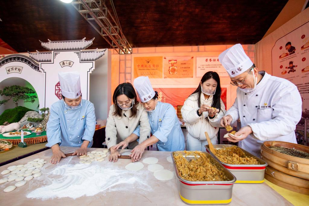 12月6日,商家在江苏省靖江市长江文化中心活动现场制作“苏味”食品。