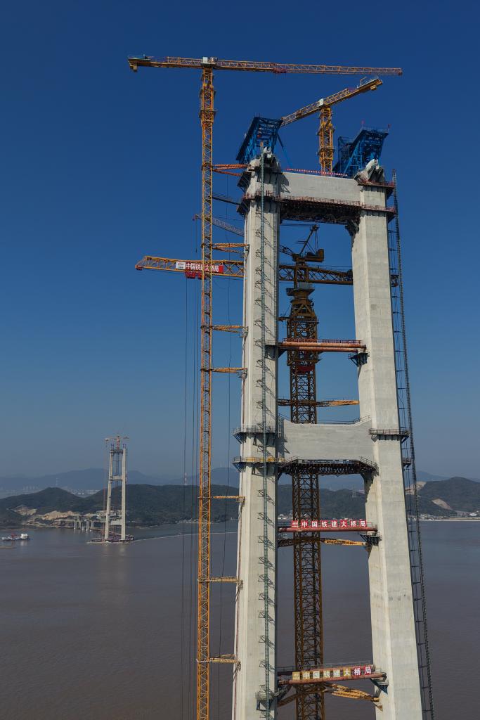 12月6日拍摄的双屿门特大桥六横侧索塔施工现场(无人机照片)。