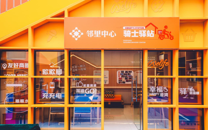 以服务新就业群体为切口,邻里中心党委推动党建资源向项目一线下沉,将党群服务阵地嵌入商圈运营的关键节点。目前,园区已建成多处“骑士驿站”,配置饮水、充电、应急药箱、阅读角等基础设施,并结合不同场景开展便民服务,努力解决骑手工作中的现实困难,增强其在城市中的归属感与获得感。